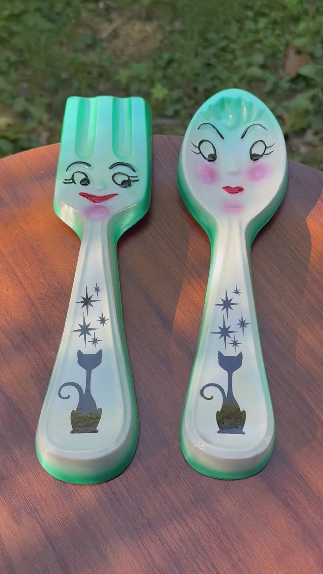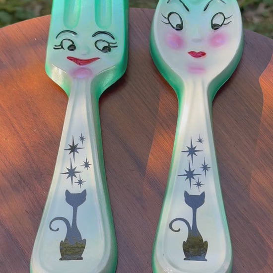 Add some kitschy mid-century charm to your kitchen with this whimsical atomic cat-themed chalkware fork & spoon set. Featuring hand-painted faces, atomic cats and retro starburst accents, these playful wall plaques bring vintage personality to any space.